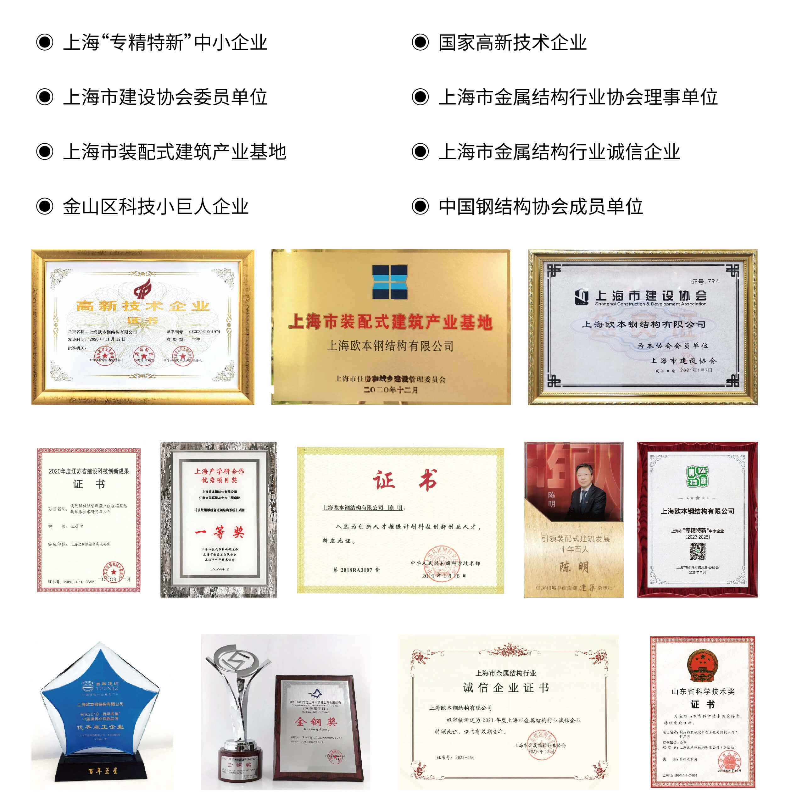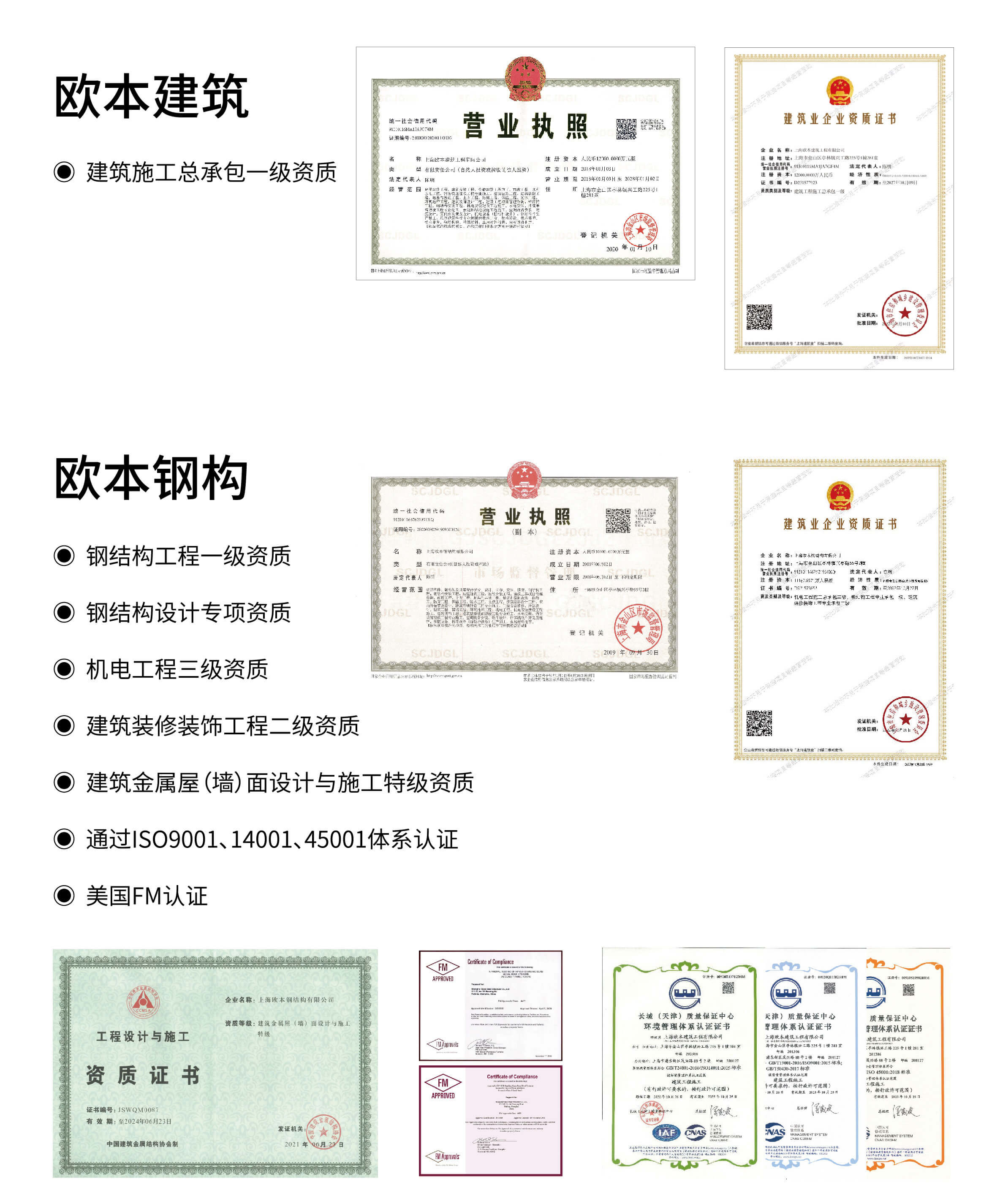 上海歐本擁有鋼結(jié)構(gòu)施工一級(jí)、總承包一級(jí)資質(zhì),有自己完善的質(zhì)量管理體系,通過(guò)ISO9001認(rèn)證,還擁有FM認(rèn)證的六個(gè)屋面系統(tǒng)。同時(shí)歐本也是上海市名牌、高新技術(shù)企業(yè)、科技小巨人。
