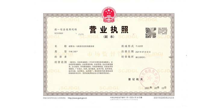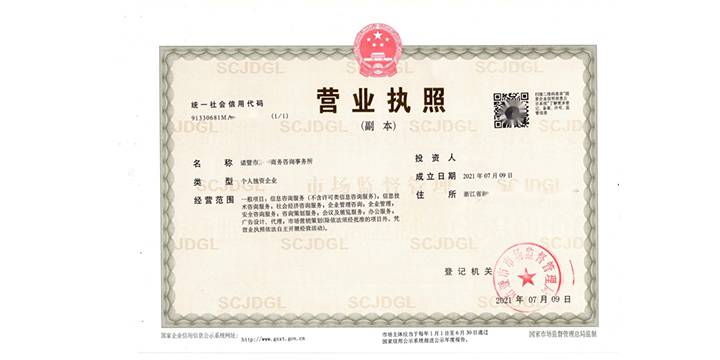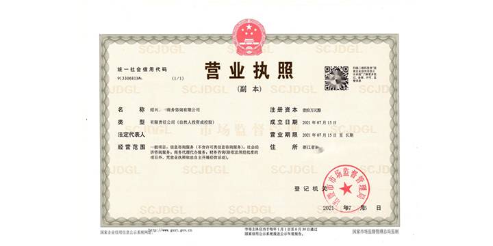 紹興商務咨詢公司案例分享:注冊資金拾萬元整,成立日期2021年7月15日,經(jīng)營范圍僅供短期參考,根據(jù)政策改變,營業(yè)范圍會有調(diào)整。經(jīng)營范圍:信息咨詢服務;社會經(jīng)濟咨詢服務;商務代理代辦服務;財務咨詢。
